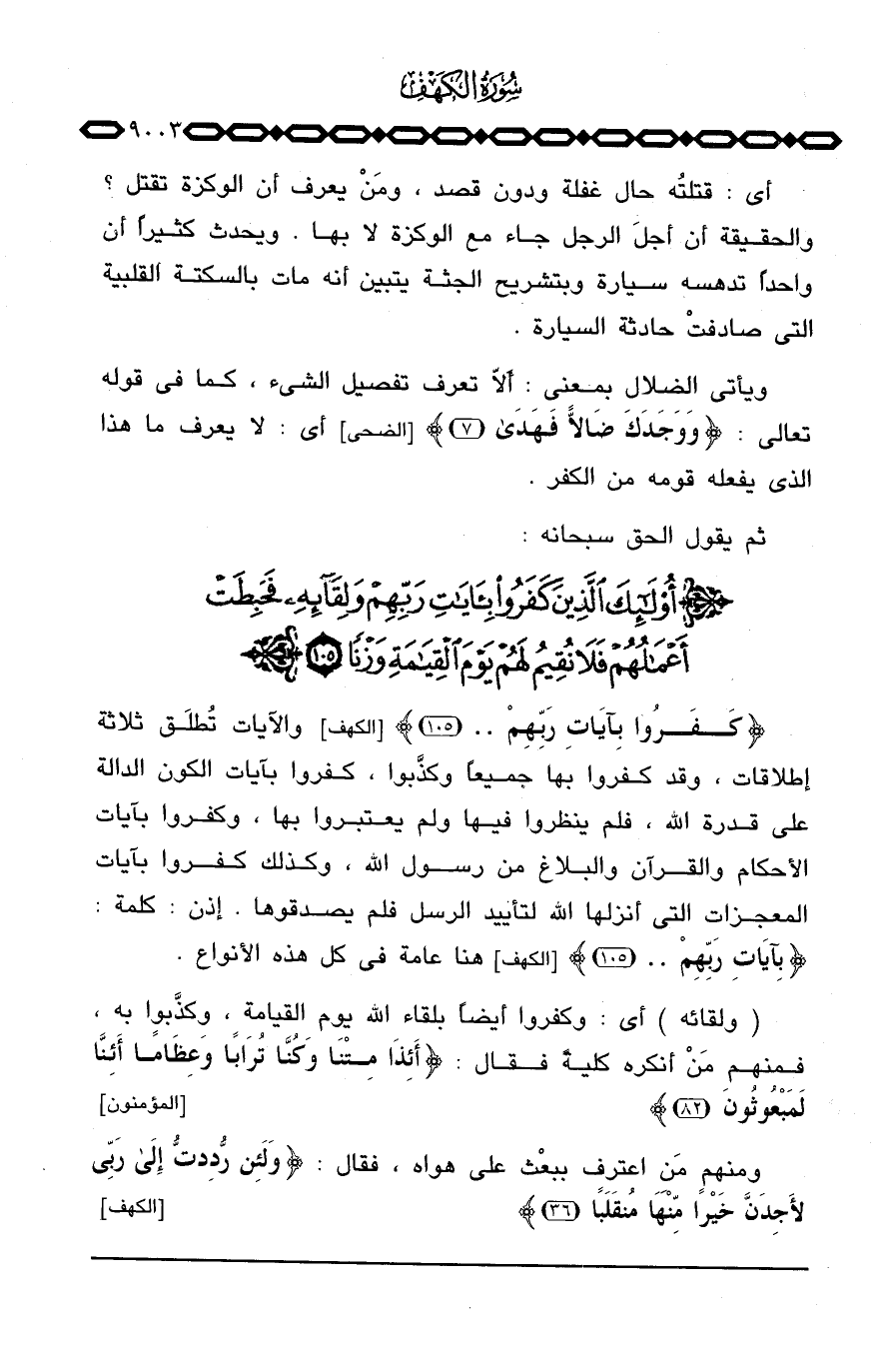 {كَفَرُواْ بِآيَاتِ رَبِّهِمْ} [الكهف: 105] والآيات تُطلَق ثلاثة إطلاقات، وقد كفروا بها جميعاً وكذَّبوا، كفروا بآيات الكون الدالة على قدرة الله، فلم ينظروا فيها ولم يعتبروا بها، وكفروا بآيات الأحكام والقرآن والبلاغ من رسول الله، وكذلك كفروا بآيات المعجزات التي أنزلها الله لتأييد الرسل فلم يصدقوها. إذن: كلمة: {بِآيَاتِ رَبِّهِمْ} [الكهف: 105] هنا عامة في كل هذه الأنواع.