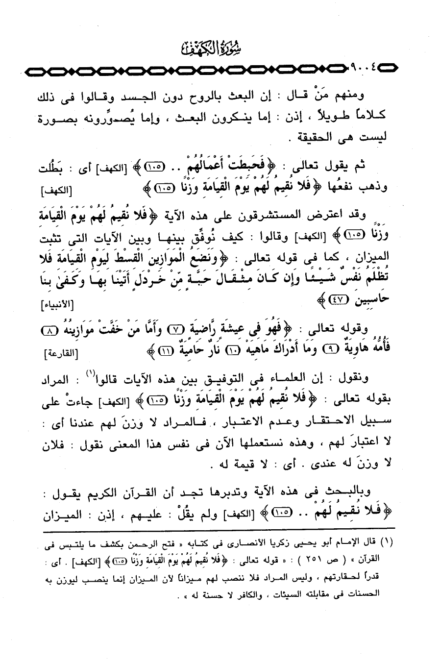 وقد اعترض المستشرقون على هذه الآية {فَلاَ نُقِيمُ لَهُمْ يَوْمَ القيامة وَزْناً} [الكهف: 105] وقالوا: كيف نُوفِّق بينها وبين الآيات التي تثبت الميزان، كما في قوله تعالى: {وَنَضَعُ الموازين القسط لِيَوْمِ القيامة فَلاَ تُظْلَمُ نَفْسٌ شَيْئاً وَإِن كَانَ مِثْقَالَ حَبَّةٍ مِّنْ خَرْدَلٍ أَتَيْنَا بِهَا وكفى بِنَا حَاسِبِينَ} [الأنبياء: 47] .