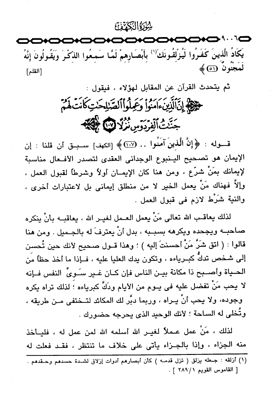 قوله: {إِنَّ الذين آمَنُواْ} [الكهف: 107] سبق أن قلنا: إن الإيمان هو تصحيح الينبوع الوجداني العقدي لتصدر الأفعال مناسبة لإيمانك بمَنْ شرّع، ومن هنا كان الإيمان أولاً وشرطاً لقبول العمل، وإلاَّ فهناك مَنْ يعمل الخير لا من منطلق إيماني بل لاعتبارات أخرى، والنية شَرْط لازم في قبول العمل.
