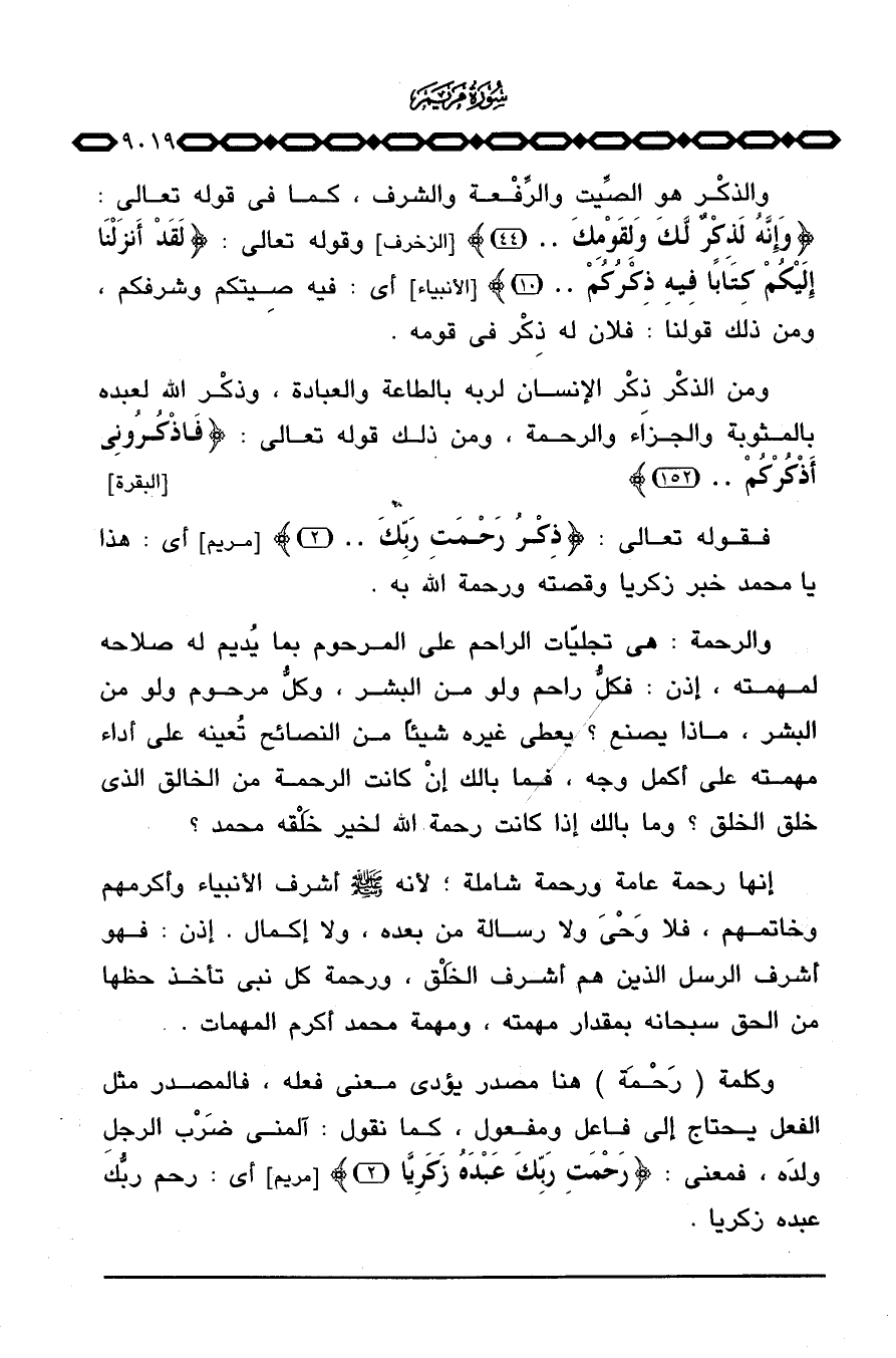 لذلك قال تعالى: {رَحْمَةِ رَبِّكَ} [مريم: 2] لأنها أعلى أنواع الرحمة، وإن كان هنا يذكر رحمته تعالى بعبده زكريا، فقد خاطب محمدا صَلَّى اللَّهُ عَلَيْهِ وَسَلَّم َ بقوله: {وَمَآ أَرْسَلْنَاكَ إِلاَّ رَحْمَةً لِّلْعَالَمِينَ} [الأنبياء: 107] فرحمة الله تعالى بمحمد ليست رحمة خاصة به، بل هي رحمة عامة لجميع العاملين، وهذه منزلة كبيرة عالية.