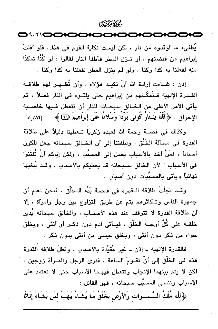 فالقدرة الإلهية إذن غير مُقيَّدة بالأسباب، وتظلّ طلاقة القدرة هذه في الخَلْق إلى أنْ تقومَ الساعة، فنرى الرجل والمرأة زوجين، لكن لا يتم بينهما الإنجاب وتتعطل فيهما الأسباب حتى لا نعتمد على الأسباب وننسى المسبِّب سبحانه، فهو القائل: