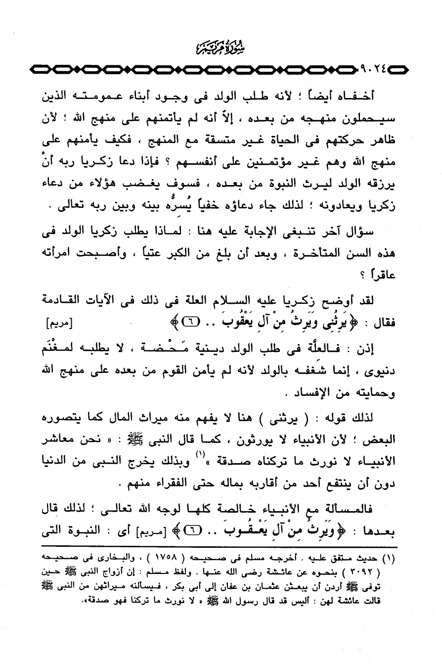 لذلك قوله: (يرثني) هنا لا يفهم منه ميراث المال كما يتصوره البعض؛ لأن الأنبياء لا يورثون، كما قال النبي صَلَّى اللَّهُ عَلَيْهِ وَسَلَّم َ «نحن معاشر الأنبياء لا نورث ما تركناه صدقة» وبذلك يخرج النبي من الدنيا دون أن ينتفع أحد من أقاربه بماله حتى الفقراء منهم.