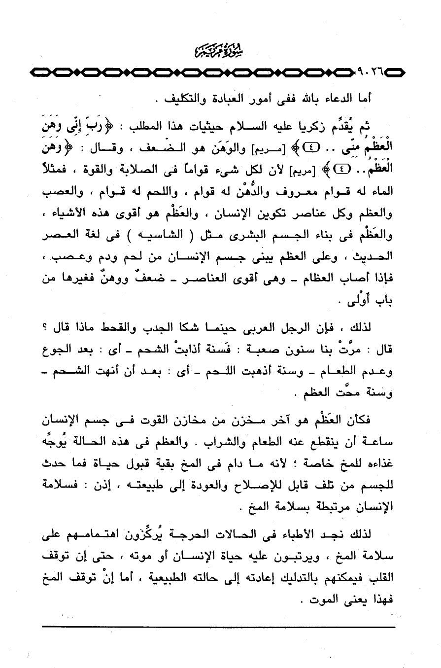 فكأن العَظْم هو آخر مخزن من مخازن القوت في جسم الإنسان ساعة أن ينقطع عنه الطعام والشراب. والعظم في هذه الحالة يُوجِّه غذاءه للمخ خاصة؛ لأنه ما دام في المخ بقية قبول حياة فما حدث للجسم من تلف قابل للإصلاح والعودة إلى طبيعته، إذن: فسلامة الإنسان مرتبطة بسلامة المخ.