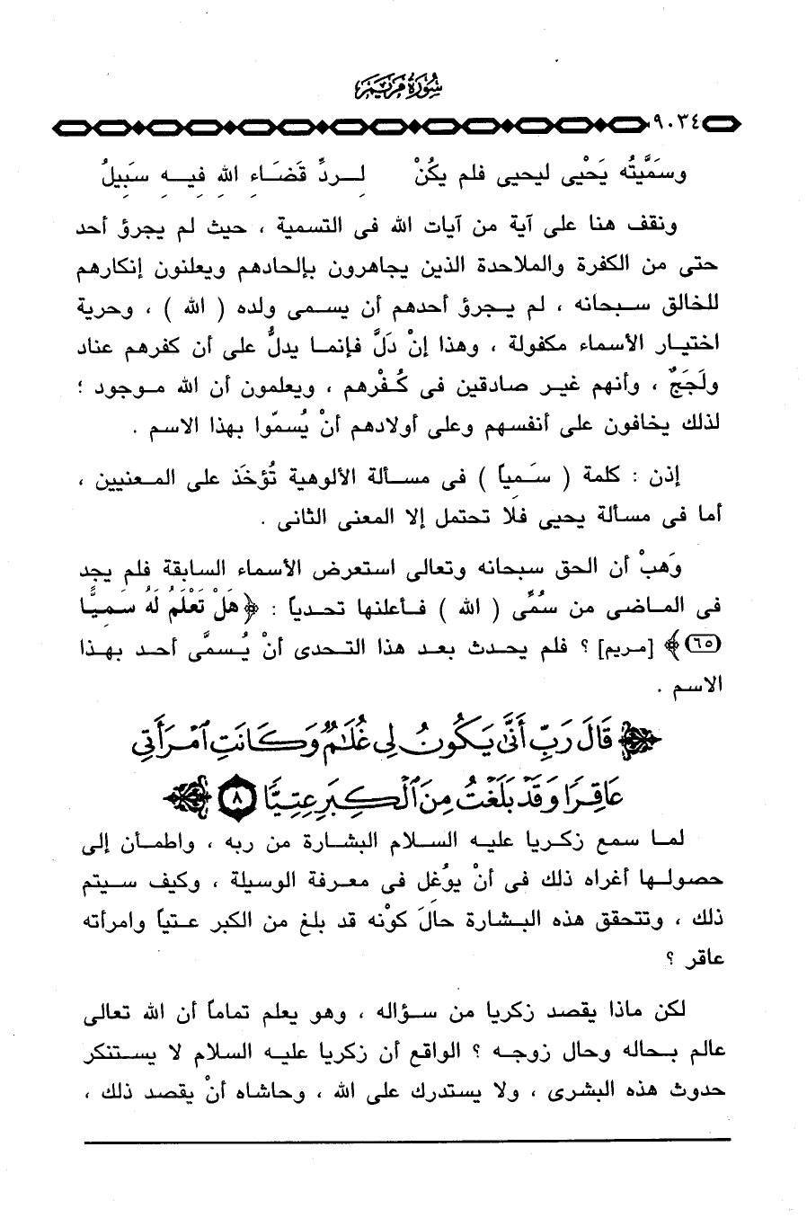 لكن ماذا يقصد زكريا من سؤاله، وهو يعلم تماماً أن الله تعالى عالم بحاله وحال زوجه؟ الواقع أن زكريا عليه السلام لا يستنكر حدوث هذه البشرى، ولا يستدرك على الله، وحاشاه أنْ يقصد ذلك،