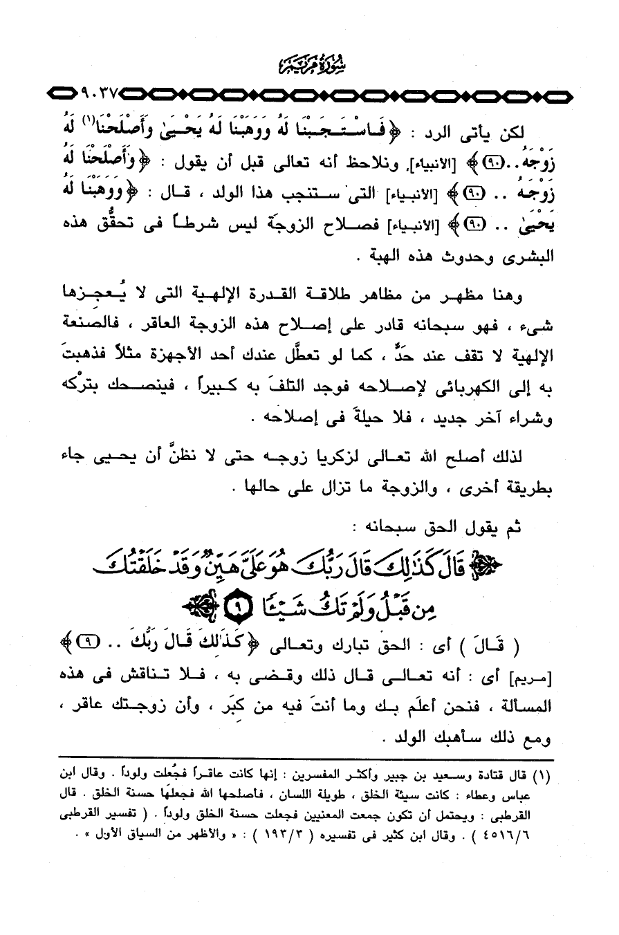 وهنا مظهر من مظاهر طلاقة القدرة الإلهية التي لا يُعجِزها شيء، فهو سبحانه قادر على إصلاح هذه الزوجة العاقر، فالصنعة الإلهية لا تقف عند حَدٍّ، كما لو تعطَّل عندك أحد الأجهزة مثلاً فذهبتَ به إلى الكهربائي لإصلاحه فوجد التلفَ به كبيراً، فينصحك بترْكه وشراء آخر جديد، فلا حيلةَ في إصلاحه.