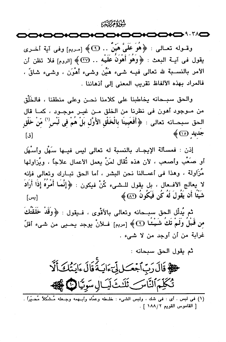 وقوله تعالى: {هُوَ عَلَيَّ هَيِّنٌ} [مريم: 9] وفي آية أخرى يقول في آية البعث: {وَهُوَ أَهْوَنُ عَلَيْهِ} [الروم: 27] فلا تظن أن الأمر بالنسبة لله تعالى فيه شيء هَيِّن وشيء أَهْوَن، وشيء شاقّ، فالمراد بهذه الألفاظ تقريب المعنى إلى أذهاننا.