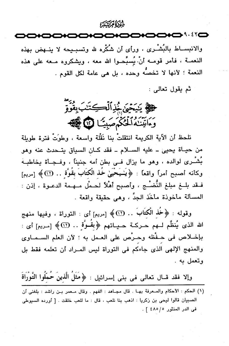 وقوله: {خُذِ الكتاب} [مريم: 12] أي: التوراة، وفيها منهج الله الذي يُنظِّم لهم حركة حياتهم {بِقُوَّةٍ} [مريم: 12] أي: بأخلاص في حِفْظه وحِرْص على العمل به؛ لأن العلم السماوي والمنهج الإلهي الذي جاءكم في التوراة ليس المراد أن تعلمه فقط بل وتعمل به.