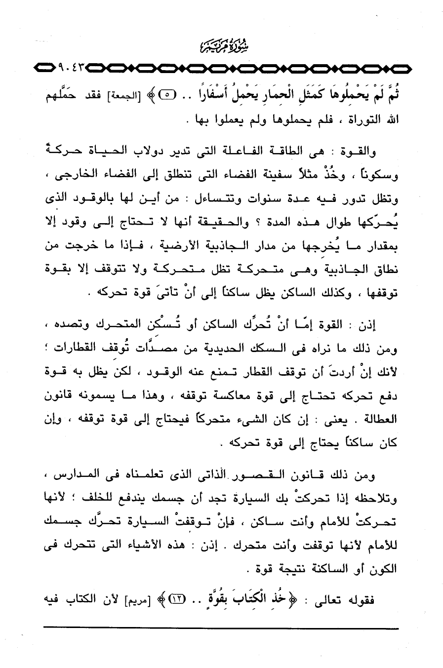 والقوة: هي الطاقة الفاعلة التي تدير دولاب الحياة حركةً وسكوناً، وخُذْ مثلاً سفينة الفضاء التي تنطلق إلى الفضاء الخارجي، وتظل تدور فيه عدة سنوات وتتساءل: من أين لها بالوقود الذي يُحرّكها طوال هذه المدة؟ والحقيقة أنها لا تحتاج: إلى وقود إلا بمقدار ما يُخرِجها من مدار الجاذبية الأرضية، فإذا ما خرجت من نطاق الجاذبية وهي متحركة تظل متحركة ولا تتوقف إلا بقوة توقفها، وكذلك الساكن يظل ساكناً إلى أنْ تأتيَ قوة تحركه.