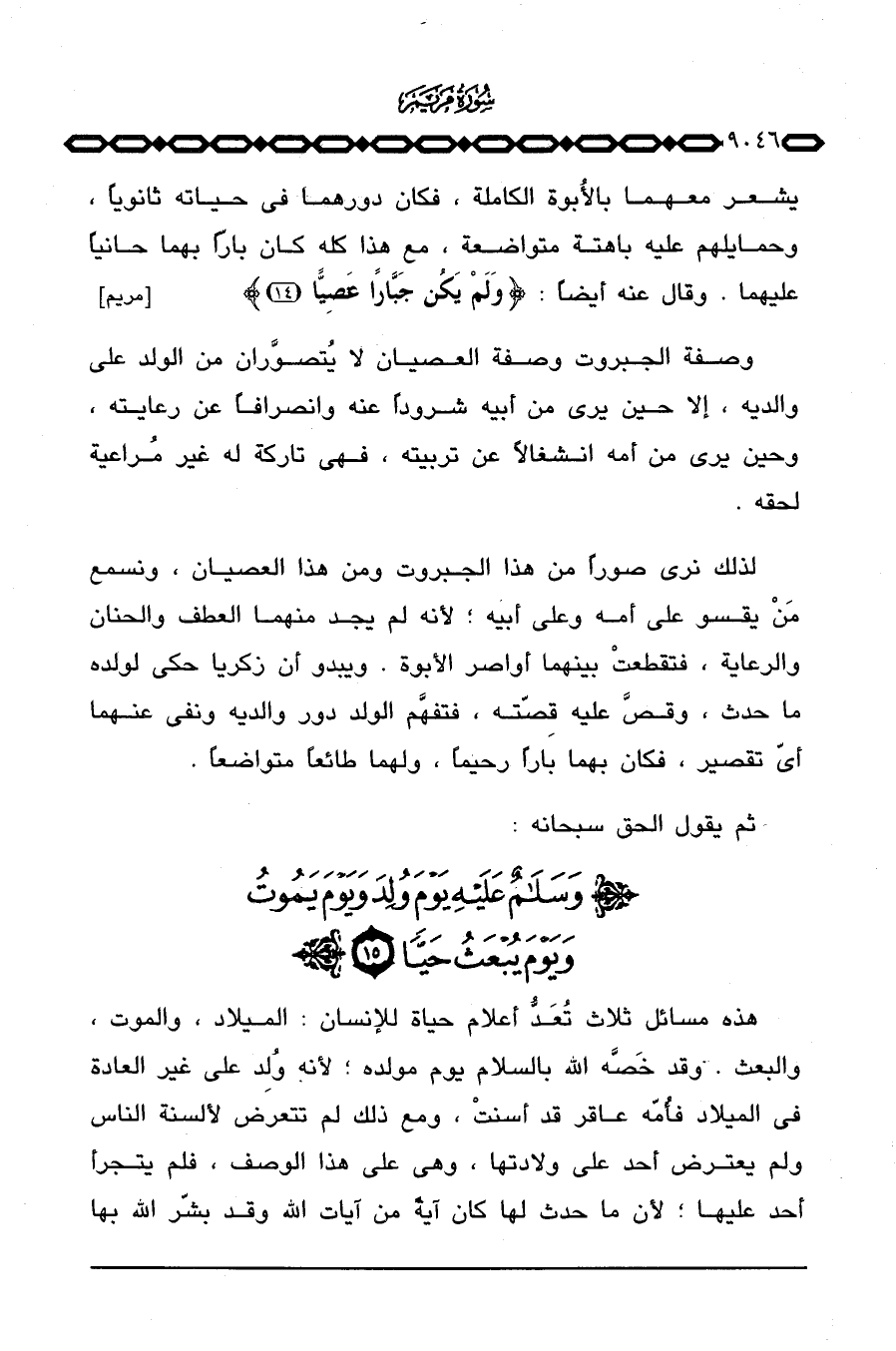 لذلك نرى صوراً من هذا الجبروت ومن هذا العصيان، ونسمع مَنْ يقسو على أمه وعلى أبيه؛ لأنه لم يجد منهما العطف والحنان والرعاية، فتقعطتْ بينهما أواصر الأبوة. ويبدو أن زكريا حكى لولده ما حدث، وقصَّ عليه قِصّته، فتفهَّم الولد دور والديه ونفى عنهما أيّ تقصير، فكان بهما باراً رحيماً، ولهما طائعاً متواضعاً.