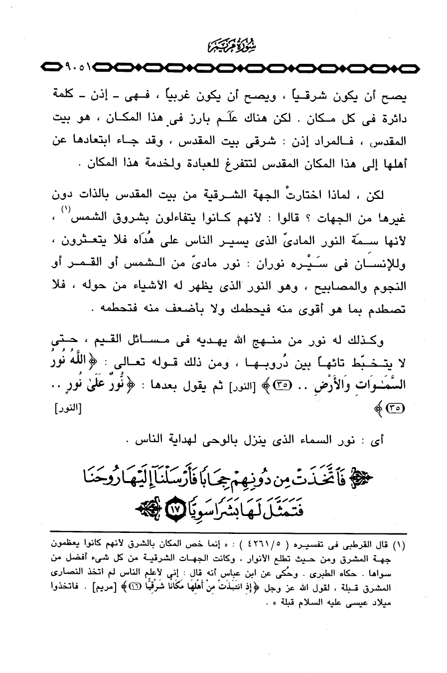 لكن، لماذا اختارتْ الجهة الشرقية من بيت المقدس بالذات دون غيرها من الجهات؟ قالوا: لأنهم كانوا يتفاءلون بشروق الشمس، لأنها سِمَة النور المادىْ الذي يسير الناس على هُدَاه فلا يتعثرون، وللإنسان في سَيْره نوران: نور مادىّ من الشمس أو القمر أو النجوم والمصابيح، وهو النور الذي يظهر له الأشياء من حوله، فلا تصطدم بما هو أقوى منه فيحطمك ولا بأضعف منه فتحطمه.