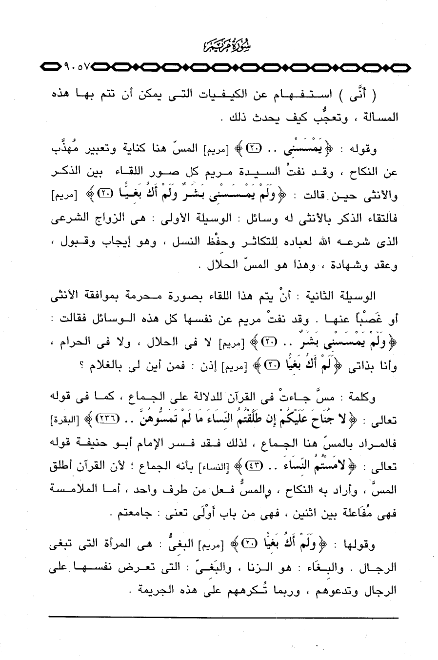 وقوله: {يَمْسَسْنِي} [مريم: 20] المسّ هنا كناية وتعبير مُهذَّب عن النكاح، وقد نفتْ السيدة مريم كل صور اللقاء بين الذكر والأنثى حين قالت: {وَلَمْ يَمْسَسْنِي بَشَرٌ وَلَمْ أَكُ بَغِيّاً} [مريم: 20] فالتقاء الذكر بالأنثى له وسائل: الوسيلة الأولى: هي الزواج الشرعي الذي شرعه الله لعباده للتكاثر وحِفْظ النسل، وهو إيجاب وقبول، وعقد وشهادة، وهذا هو المسّ الحلال.