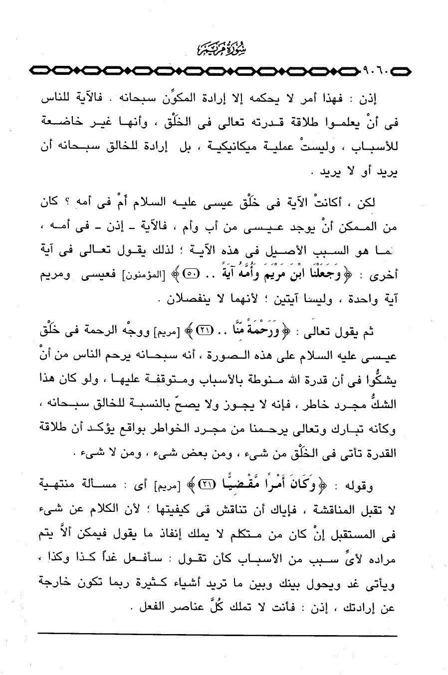 ثم يقول تعالى: {وَرَحْمَةً مِّنَّا} [مريم: 21] ووجْه الرحمة في خَلْق عيسى عليه السلام على هذه الصورة، أنه سبحانه يرحم الناس من أنْ يشكُّوا في أن قدرة الله منوطة بالأسباب ومتوقفة عليها، ولو كان هذا الشكُّ مجرد خاطر، فإنه لا يجوز ولا يصحّ بالنسبة للخالق سبحانه، وكأنه تبارك وتعالى يرحمنا من مجرد الخواطر بواقع يؤكد أن طلاقة القدرة تأتي في الخَلْق من شيء، ومن بعض شيء، ومن لا شيء.