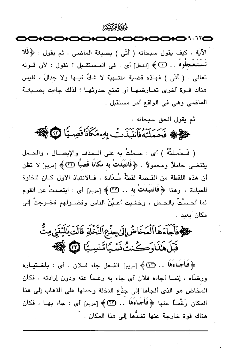 (فَحَملتْهُ) أي: حملتْ به على الحذف والإيصال، والحمل يقتضي حاملاً ومحمولاً. {فانتبذت بِهِ مَكَاناً قَصِيّاً} [مريم: 22] لا تظن أن هذه اللقطة من القصة لقطةٌ مُعَادة، فالانتباذ الأول كان للخلوة للعبادة، وهنا {فانتبذت بِهِ} [مريم: 22] أي: ابتعدتْ عن القوم لما أحسَّتْ بالحمل، وخشيت أعيُنَ الناس وفضولهم فخرجتْ إلى مكان بعيد.