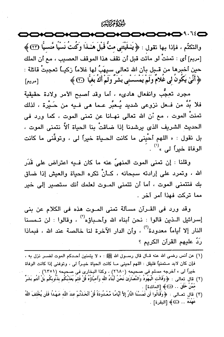 وقلنا: إن تمني الموت المنهيّ عنه ما كان فيه اعتراض على قَدَر الله، وتمرد على إرادته سبحانه، كأنْ تكره الحياة والعيش إذا ضاق بك فتتمنى الموت، أما أن تتمنى الموت لعلمك أنك ستصبر إلى خير مما تركت فهذا أمر آخر.