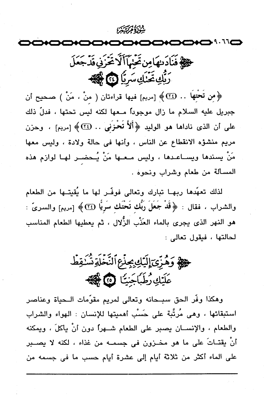 {مِن تَحْتِهَآ} [مريم: 24] فيها قراءتان (مِنْ، مَنْ) صحيح أن جبريل عليه السلام ما زال موجوداً معها لكنه ليس تحتها، فدلّ ذلك على أن الذي ناداها هو الوليد {أَلاَّ تَحْزَنِي} [مريم: 24] ، وحزن مريم منشؤه الانقطاع عن الناس، وأنها في حالة ولادة، وليس معها مَنْ يسندها ويساعدها، وليس معها مَنْ يَحضِر لها لوازم هذه المسألة من طعام وشراب ونحوه.