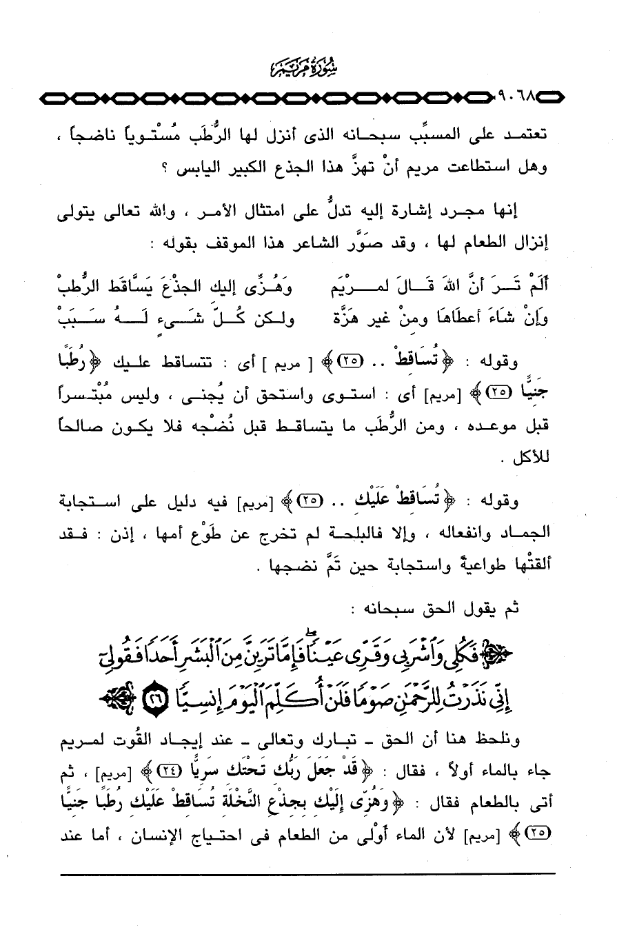 ونلحظ هنا أن الحق تبارك وتعالى عند إيجاد القُوت لمريم جاء بالماء أولاً، فقال: {قَدْ جَعَلَ رَبُّكِ تَحْتَكِ سَرِيّاً} [مريم: 24] ، ثم أتى بالطعام فقال: {وهزى إِلَيْكِ بِجِذْعِ النخلة تُسَاقِطْ عَلَيْكِ رُطَباً جَنِيّاً} [مريم: 25] لأن الماء أوْلى من الطعام في احتياج الإنسان، أما عند