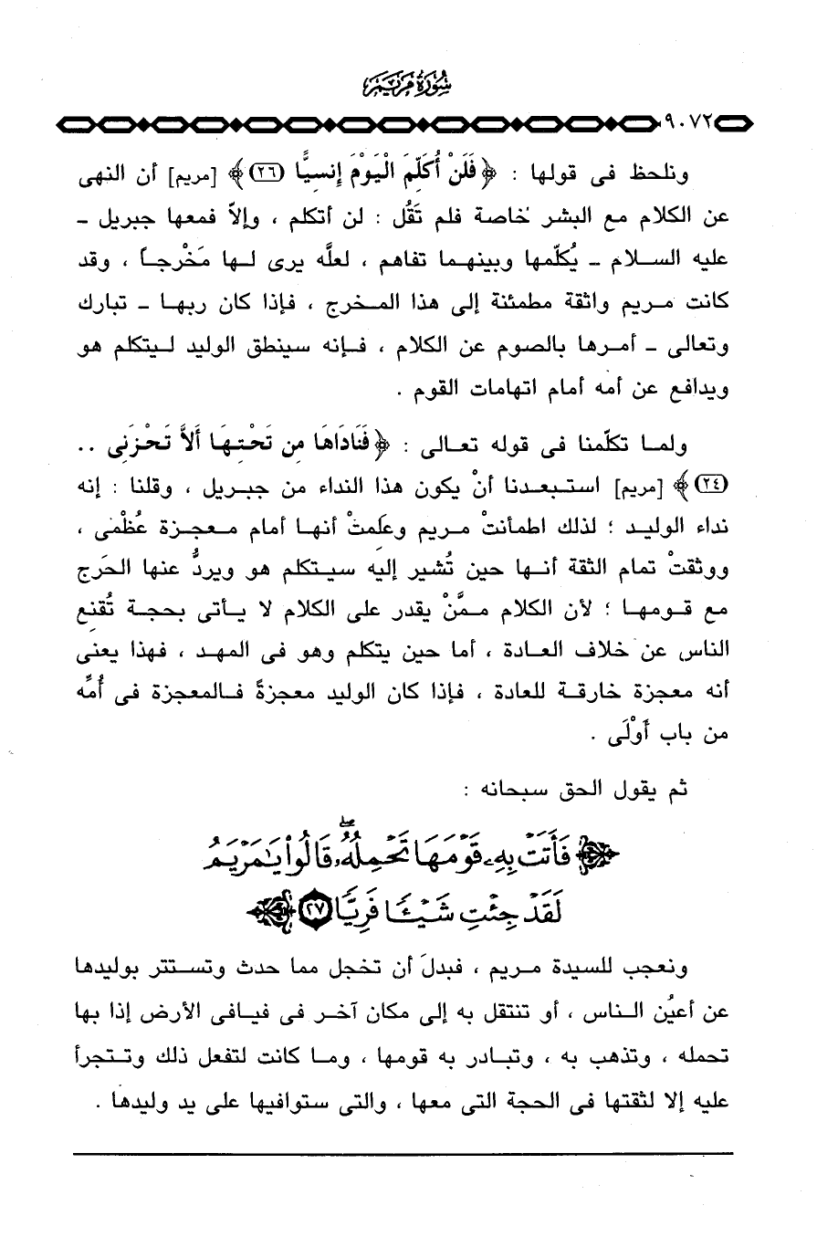 ولما تكلّمنا في قوله تعالى: {فَنَادَاهَا مِن تَحْتِهَآ أَلاَّ تَحْزَنِي} [مريم: 24] استبعدنا أنْ يكون هذا النداء من جبريل، وقلنا: إنه نداء الوليد؛ لذلك اطمأنتْ مريم وعَلِمتْ أنها أمام معجزة عُظْمى، ووثقتْ تمام الثقة أنها حين تُشير إليه سيتكلم هو ويردُّ عنها الحَرج مع قومها؛ لأن الكلام ممَّنْ يقدر على الكلام لا يأتي بحجة تُقنِع الناس عن خلاف العادة، أما حين يتكلم وهو في المهد، فهذا يعني أنه معجزة خارقة للعادة، فإذا كان الوليد معجزةً فالمعجزة في أُمِّه من باب أَوْلَى.