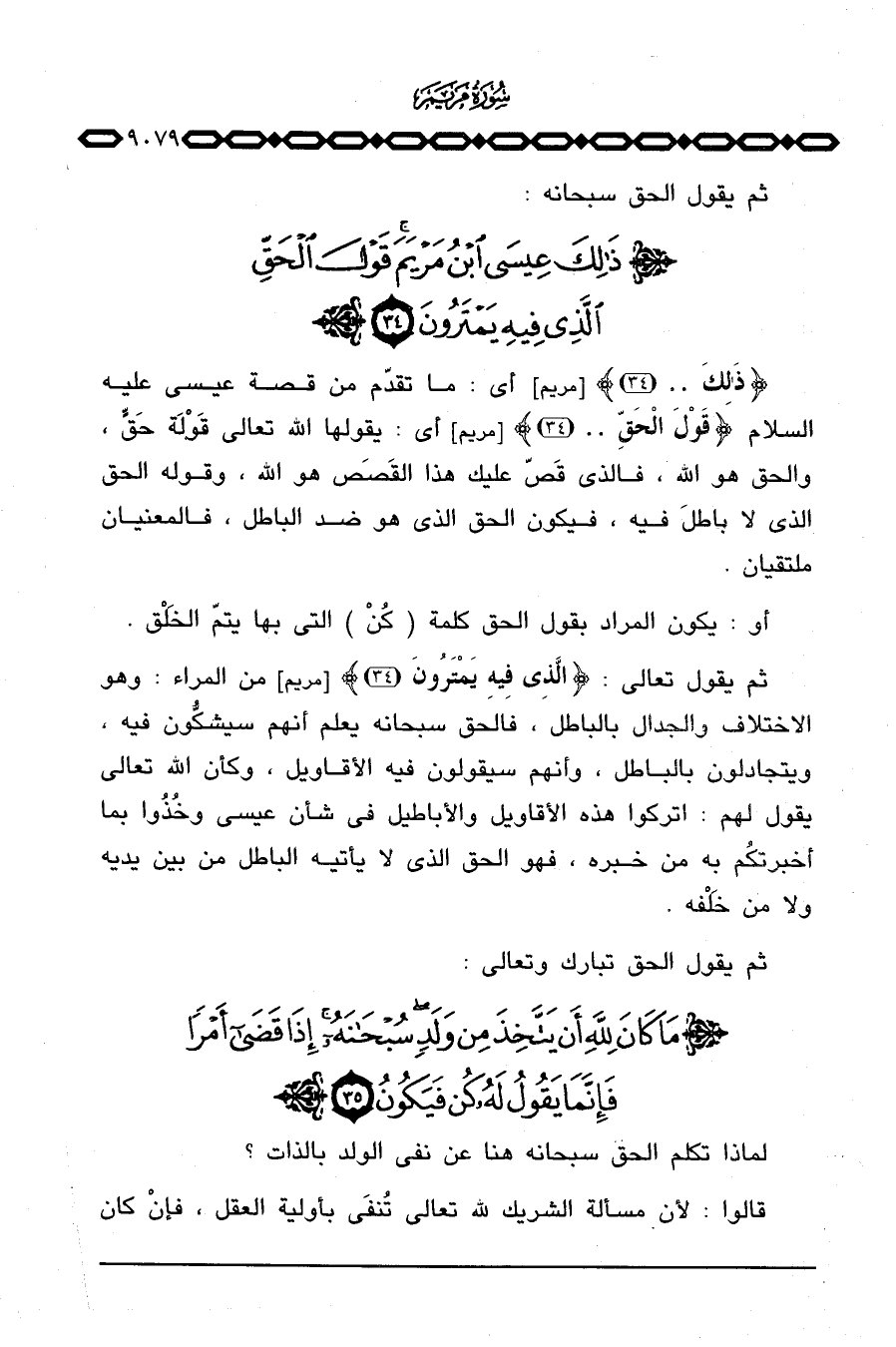 {ذلك} [مريم: 34] أي: ما تقدّم من قصة عيسى عليه السلام {قَوْلَ الحق} [مريم: 34] أي: يقولها الله تعالى قَوْلَة حَقٍّ، والحق هو الله، فالذي قَصّ عليك هذا القَصَص هو الله، وقوله الحق الذي لا باطلَ فيه، فيكون الحق الذي هو ضد الباطل، فالمعنيان ملتقيان.