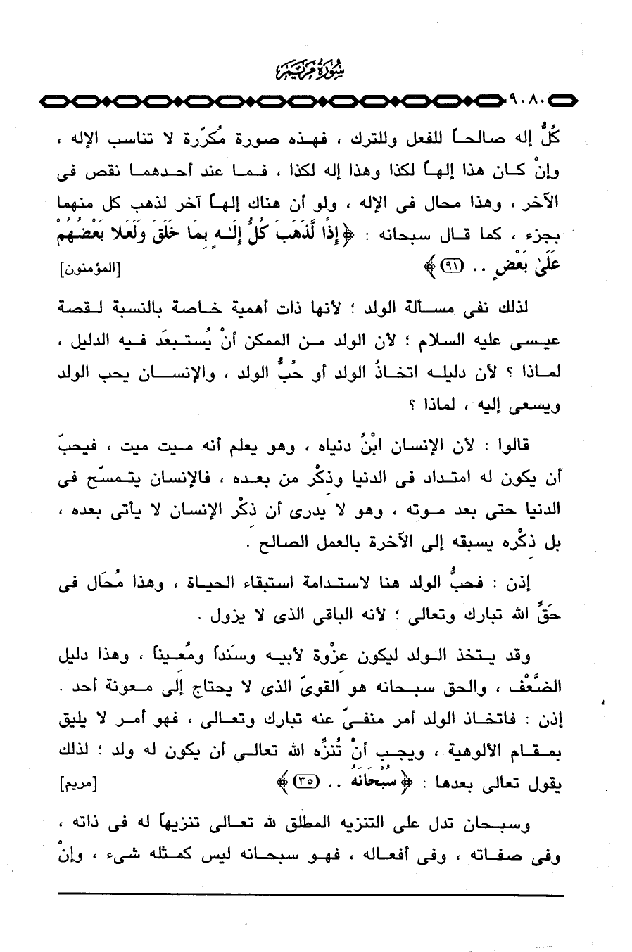كُلُّ إ له صالحاً للفعل وللترك، فهذه صورة مُكرّرة لا تناسب الإله، وإنْ كان هذا إلهاً لكذا وهذا إله لكذا، فما عند أحدهما نقص في الآخر، وهذا محال في الإله، ولو أن هناك إلهاً آخر لذهب كل منهما بجزء، كما قال سبحانه: {إِذاً لَّذَهَبَ كُلُّ إله بِمَا خَلَقَ وَلَعَلاَ بَعْضُهُمْ على بَعْضٍ} [المؤمنون: 91] .