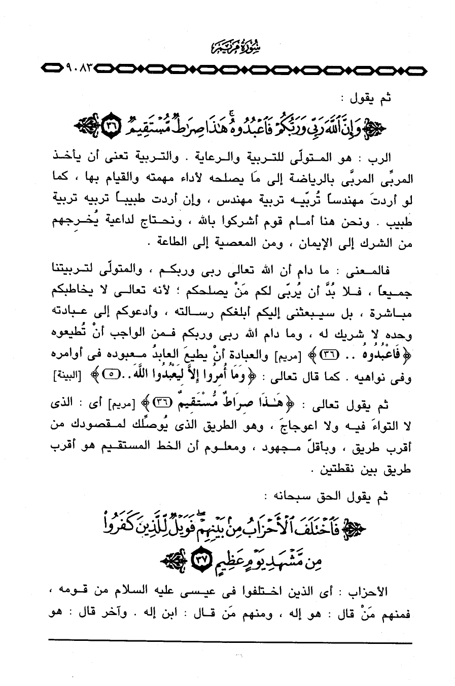 ثم يقول تعالى: {هذا صِرَاطٌ مُّسْتَقِيمٌ} [مريم: 36] أي: الذي لا التواءَ فيه ولا اعوجاجَ، وهو الطريق الذي يُوصِّلك لمقصودك من أقرب طريق، وبأقلّ مجهود، ومعلوم أن الخط المستقيم هو أقرب طريق بين نقطتين.