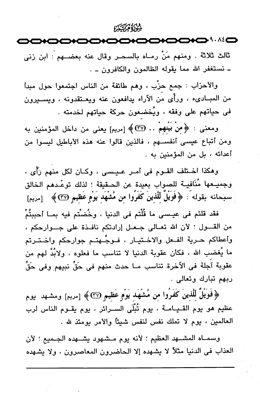 {فَوْيْلٌ لِّلَّذِينَ كَفَرُواْ مِن مَّشْهَدِ يَوْمٍ عَظِيمٍ} [مريم: 37] ومشهد يوم عظيم هو يوم القيامة، يوم تُبْلَى السرائر، يوم يقوم الناس لرب العالمين، يوم لا تملك نفس لنفس شيئاً والأمر يومئذ لله.
