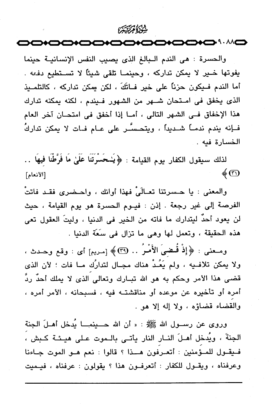 والحسرة: هي الندم البالغ الذي يصيب النفس الإنسانية حينما يفوتها خير لا يمكن تداركه، وحينما تلقى شيئاً لا تستطيع دفعه أما الندم فيكون حزناً على خير فاتَكَ، لكن يمكن تداركه، كالتلميذ الذي يخفق في امتحان شهر من الشهور فيندم، لكنه يمكنه تدارك هذا الإخفاق في الشهر التالي، أما إذا أخفق في امتحان آخر العام فإنه يندم ندماً شديداً، ويتحسَّر على عام فات لا يمكن تداركُ الخسارة فيه.