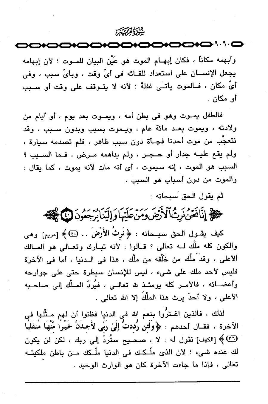 كيف يقول الحق سبحانه: {نَرِثُ الأرض} [مريم: 40] وهي والكون كله مِلْك له تعالى؟ قالوا: لأنه تبارك وتعالى هو المالك الأعلى، وقد ملَّك من خَلْقه من ملَّك، هذا في الدنيا، أما في الآخرة فليس لأحد ملك على شيء، ليس للإنسان سيطرة حتى على جوارحه وأعضائه، فالأمر كله يومئذ لله تعَالى، فيُردّ الملْك إلى صاحبه الأعلى، ولا أحدَ يرث هذا الملْكَ إلا الله تعالى.