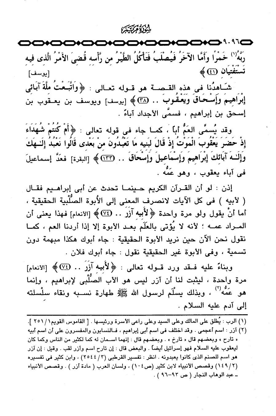 وبناءً عليه فقد ورد قوله تعالى: {لأَبِيهِ آزَرَ} [الأنعام: 74] مرة واحدة، ليثبت لنا أن آزر ليس هو الأب الصُّلْبي لإبراهيم، وإنما هو عَمَّه، وبذلك يسْلَم لرسول الله صَلَّى اللَّهُ عَلَيْهِ وَسَلَّم َ طهارة نسبه ونقاء سِلْسلته إلى آدم عليه السلام.