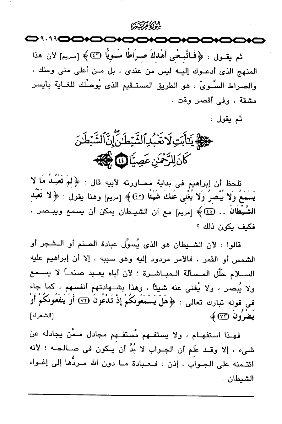 نلحظ أن إبراهيم في بداية محاورته لأبيه قال: {لِمَ تَعْبُدُ مَا لاَ يَسْمَعُ وَلاَ يُبْصِرُ وَلاَ يُغْنِي عَنكَ شَيْئاً} [مريم: 42] وهنا يقول: {لاَ تَعْبُدِ الشيطان} [مريم: 44] مع أن الشيطان يمكن أن يسمع ويبصر، فكيف يكون ذلك؟