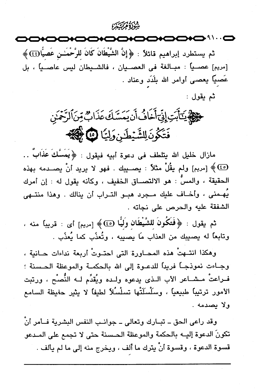مازال خليل الله يتلطف في دعوة أبيه فيقول: {يَمَسَّكَ عَذَابٌ} [مريم: 45] ولم يقُلْ مثلاً: يصيبك. فهو لا يريد أنْ يصدمه بهذه الحقيقة، والمسُّ: هو الالتصاق الخفيف، وكأنه يقول له: إن أمرك يُهمني، وأخاف عليك مجرد هبو التراب أن ينالك. وهذا منتهى الشفقة عليه والحرص على نجاته.