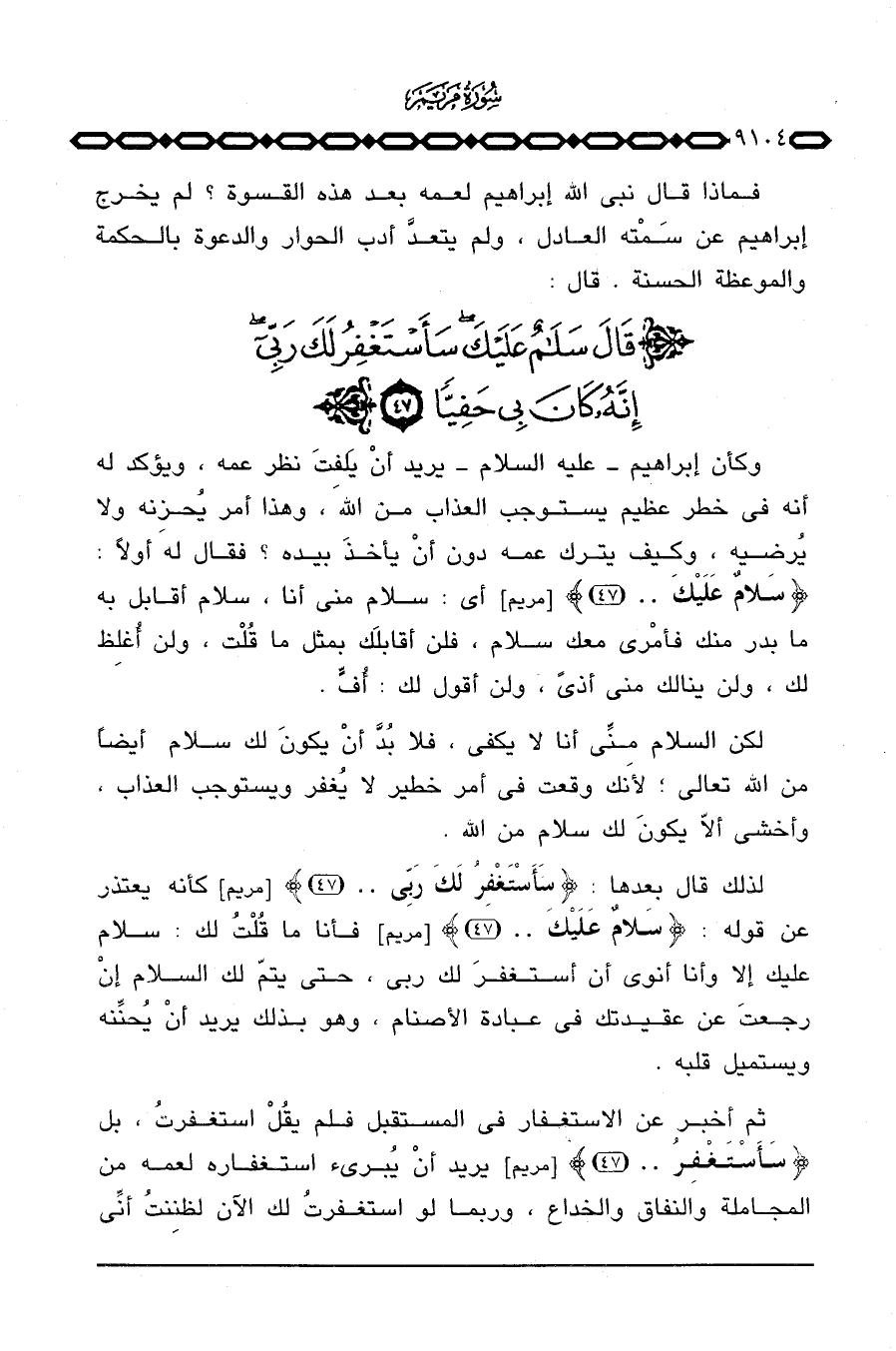 وكأن إبراهيم عليه السلام يريد أنْ يَلفِتَ نظر عمه، ويؤكد له أنه في خطر عظيم يستوجب العذاب من الله، وهذا أمر يُحزِنه ولا يُرضيه، وكيف يترك عمه دون أنْ يأخذَ بيده؟ فقال له أولاً: {سَلاَمٌ عَلَيْكَ} [مريم: 47] أي: سلام مني أنا، سلام أقابل به ما بدر منك فأمْري معك سلام، فلن أقابلَك بمثل ما قُلْت، ولن أُغلِظ لك، ولن ينالك مني أذىً، ولن أقول لك: أُفٍّ.