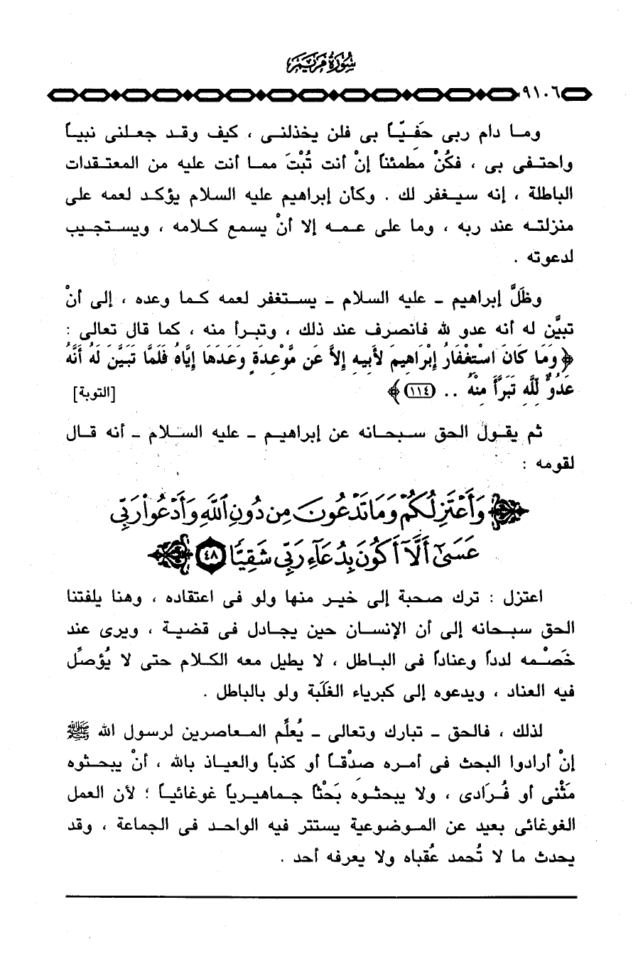وظَلَّ إبراهيم عليه السلام يستغفر لعمه كما وعده، إلى أنْ تبيَّن له أنه عدو لله فانصرف عند ذلك، وتبرأ منه، كما قال تعالى: {وَمَا كَانَ استغفار إِبْرَاهِيمَ لأَبِيهِ إِلاَّ عَن مَّوْعِدَةٍ وَعَدَهَآ إِيَّاهُ فَلَمَّا تَبَيَّنَ لَهُ أَنَّهُ عَدُوٌّ للَّهِ تَبَرَّأَ مِنْهُ} [التوبة: 114] .