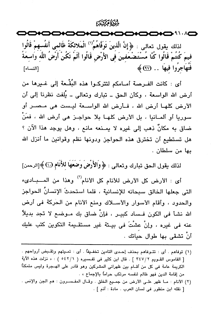 لذلك يقول تعالى: {إِنَّ الذين تَوَفَّاهُمُ الملائكة ظالمي أَنْفُسِهِمْ قَالُواْ فِيمَ كُنتُمْ قَالُواْ كُنَّا مُسْتَضْعَفِينَ فِي الأرض قالوا أَلَمْ تَكُنْ أَرْضُ الله وَاسِعَةً فَتُهَاجِرُواْ فِيهَا} [النساء: 97] .