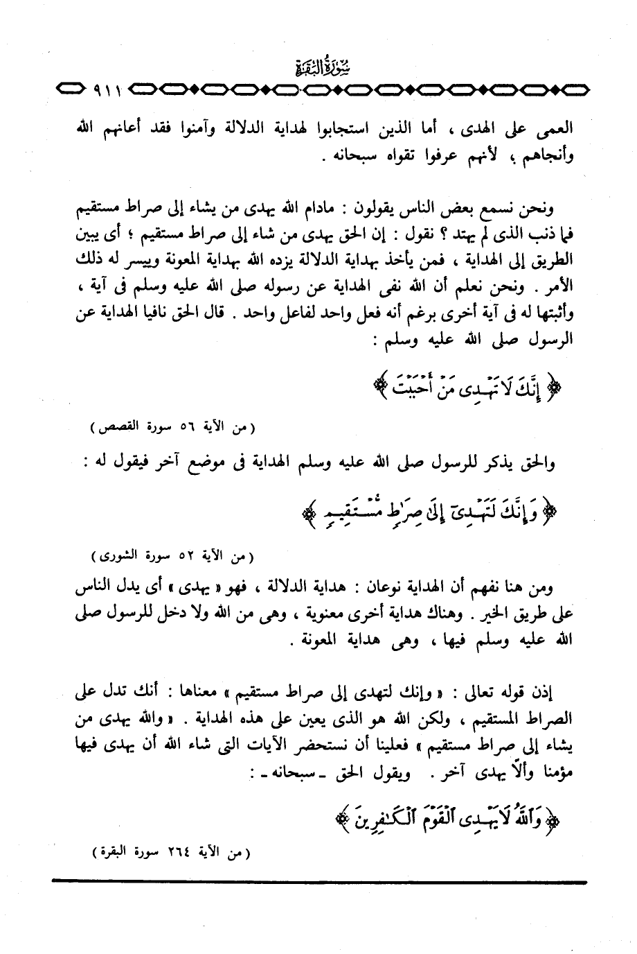 ونحن نسمع بعض الناس يقولون: ما دام الله يهدي من يشاء إلى صراط مستقيم فما ذنب الذي لم يهتد؟ نقول: إن الحق يهدي من شاء إلى صراط مستقيم؛ أي يبين الطريق إلى الهداية، فمن يأخذ بهداية الدلالة يزده الله بهداية المعونة وييسر له ذلك الأمر. ونحن نعلم أن الله نفى الهداية عن رسول الله صَلَّى اللَّهُ عَلَيْهِ وَسَلَّم َ في آية، وأثبتها له في آية أخرى برغم أنه فعل واحد لفاعل واحد. قال الحق نافيا الهداية عن الرسول صَلَّى اللَّهُ عَلَيْهِ وَسَلَّم َ: {إِنَّكَ لاَ تَهْدِي مَنْ أَحْبَبْتَ} [القصص: 56]