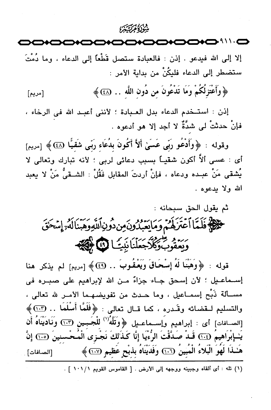 قوله: {وَهَبْنَا لَهُ إِسْحَاقَ وَيَعْقُوبَ} [مريم: 49] لم يذكر هنا إسماعيل؛ لأن إسحق جاء جزاءً من الله لإبراهيم على صبره في مسألة ذَبْح إسماعيل، وما حدث من تفويضهما الأمر لله تعالى، والتسليم لقضائه وقَدرهِ، كما قال تعالى: {فَلَمَّا أَسْلَمَا} [الصافات: 103] أي: إبراهيم وإسماعيل {وَتَلَّهُ لِلْجَبِينِ وَنَادَيْنَاهُ أَن ياإبراهيم قَدْ صَدَّقْتَ الرؤيآ إِنَّا كَذَلِكَ نَجْزِي المحسنين إِنَّ هذا لَهُوَ البلاء المبين وَفَدَيْنَاهُ بِذِبْحٍ عَظِيمٍ} [الصافات: 103107] .