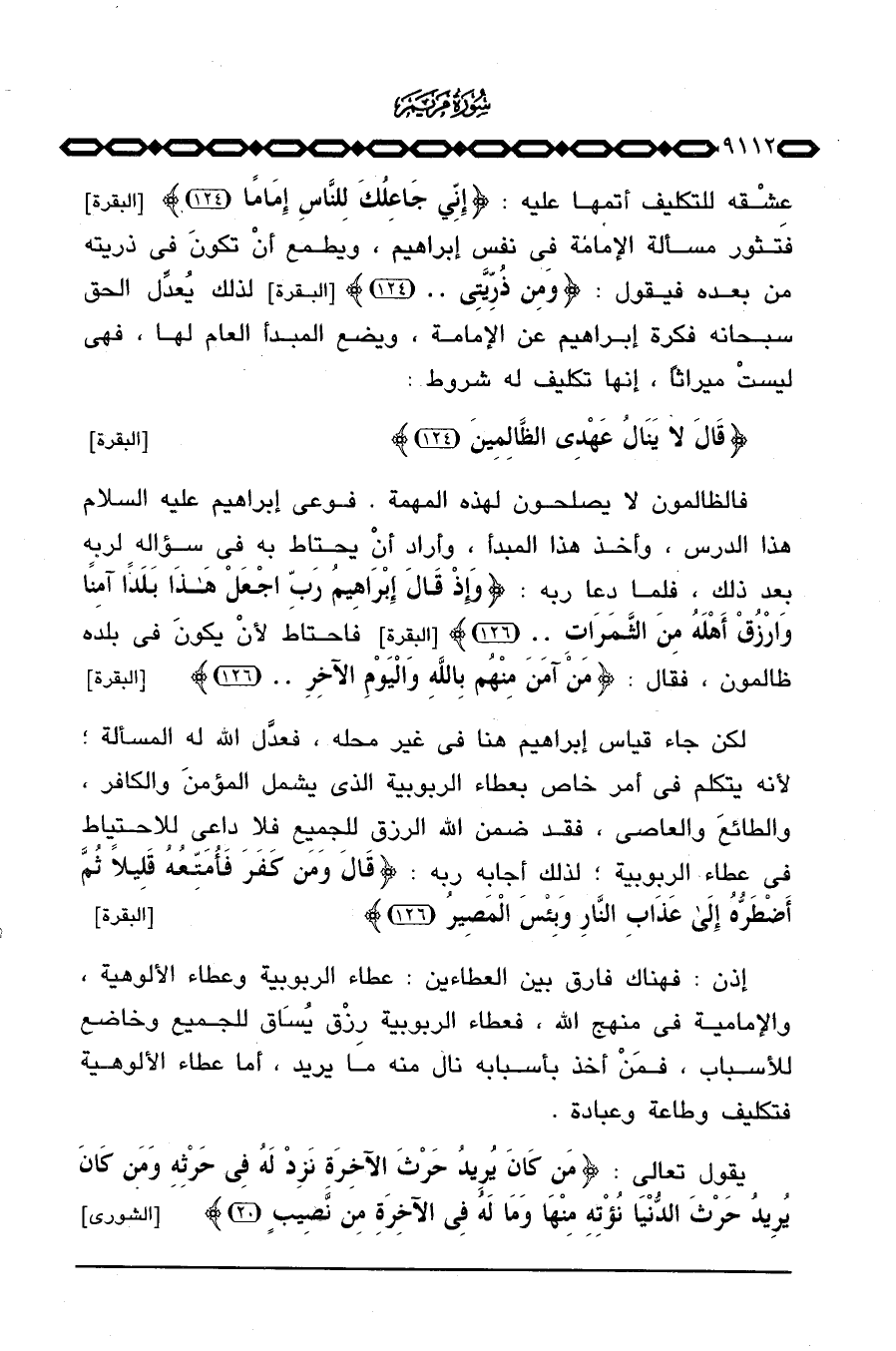 عِشْقه للتكليف أتمها عليه: {إِنِّي جَاعِلُكَ لِلنَّاسِ إِمَاماً} [البقرة: 124] فتثور مسألة الإمامة في نفس إبراهيم، ويطمع أنْ تكونَ في ذريته من بعده فيقول: {وَمِن ذُرِّيَّتِي} [البقرة: 124] لذلك يُعدِّل الحق سبحانه فكرة إبراهيم عن الإمامة، ويضع المبدأ العام لها، فهي ليستْ ميراثاً، إنها تكليف له شروط.