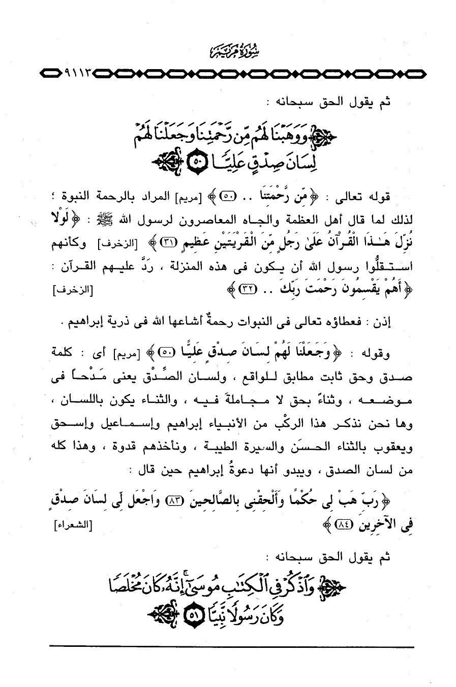 قوله تعالى: {مِّن رَّحْمَتِنَا} [مريم: 50] المراد بالرحمة النبوة؛ لذلك لما قال أهل العظمة والجاه المعاصرون لرسول الله صَلَّى اللَّهُ عَلَيْهِ وَسَلَّم َ: {لَوْلاَ نُزِّلَ هذا القرآن على رَجُلٍ مِّنَ القريتين عَظِيمٍ} [الزخرف: 31] وكأنهم استقلُّوا رسول الله أن يكون في هذه المنزلة، رَدَّ عليهم القرآن: {أَهُمْ يَقْسِمُونَ رَحْمَتَ رَبِّكَ} [الزخرف: 32] .