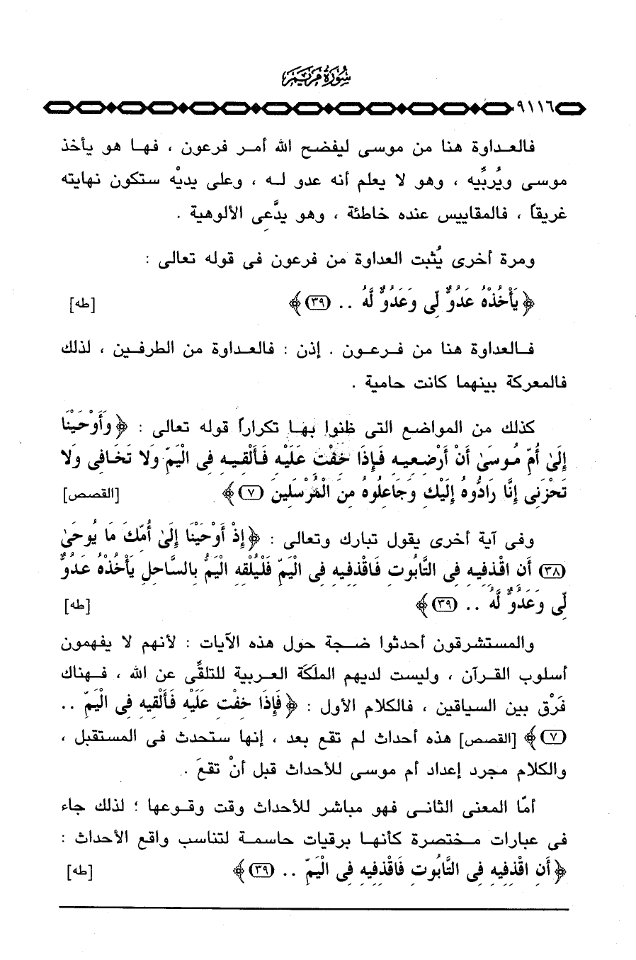 والمستشرقون أحدثوا ضجة حول هذه الآيات: لأنهم لا يفهمون أسلوب القرآن، وليست لديهم الملَكَة العربية للتلقِّي عن الله، فهناك فَرْق بين السياقين، فالكلام الأول: {فَإِذَا خِفْتِ عَلَيْهِ فَأَلْقِيهِ فِي اليم} [القصص: 7] هذه أحداث لم تقع بعد، إنها ستحدث في المستقبل، والكلام مجرد إعداد أم موسى للأحداث قبل أنْ تقعَ.
