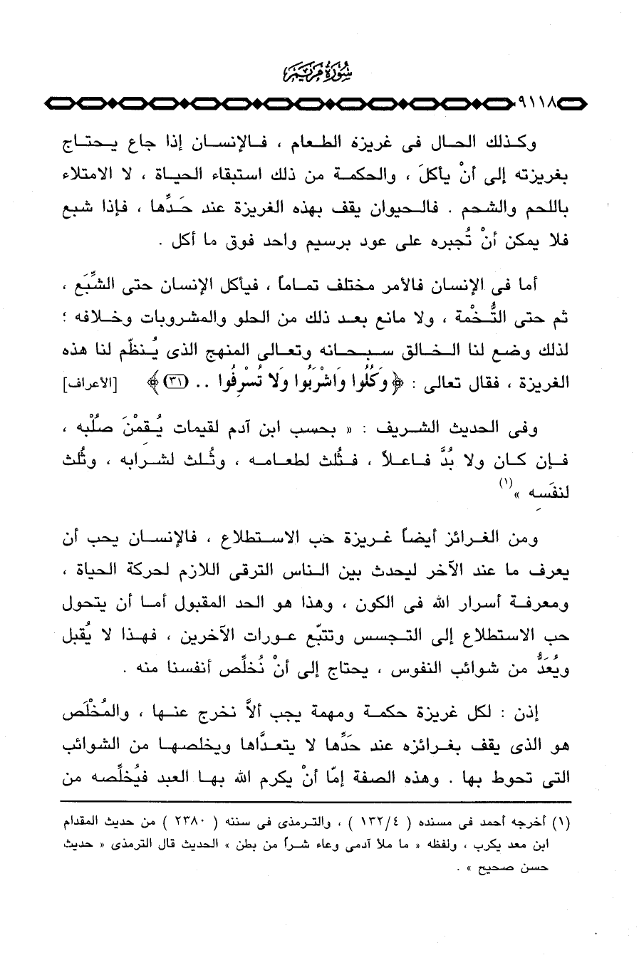 وكذلك الحال في غريزة الطعام، فالإنسان إذا جاع يحتاج بغريزته إلى أنْ يأكلَ، والحكمة من ذلك استبقاء الحياة، لا الامتلاء باللحم والشحم. فالحيوان يقف بهذه الغريزة عند حَدِّها، فإذا شبع لا يمكن أنْ تُجبره على عود برسيم واحد فوق ما أكل.