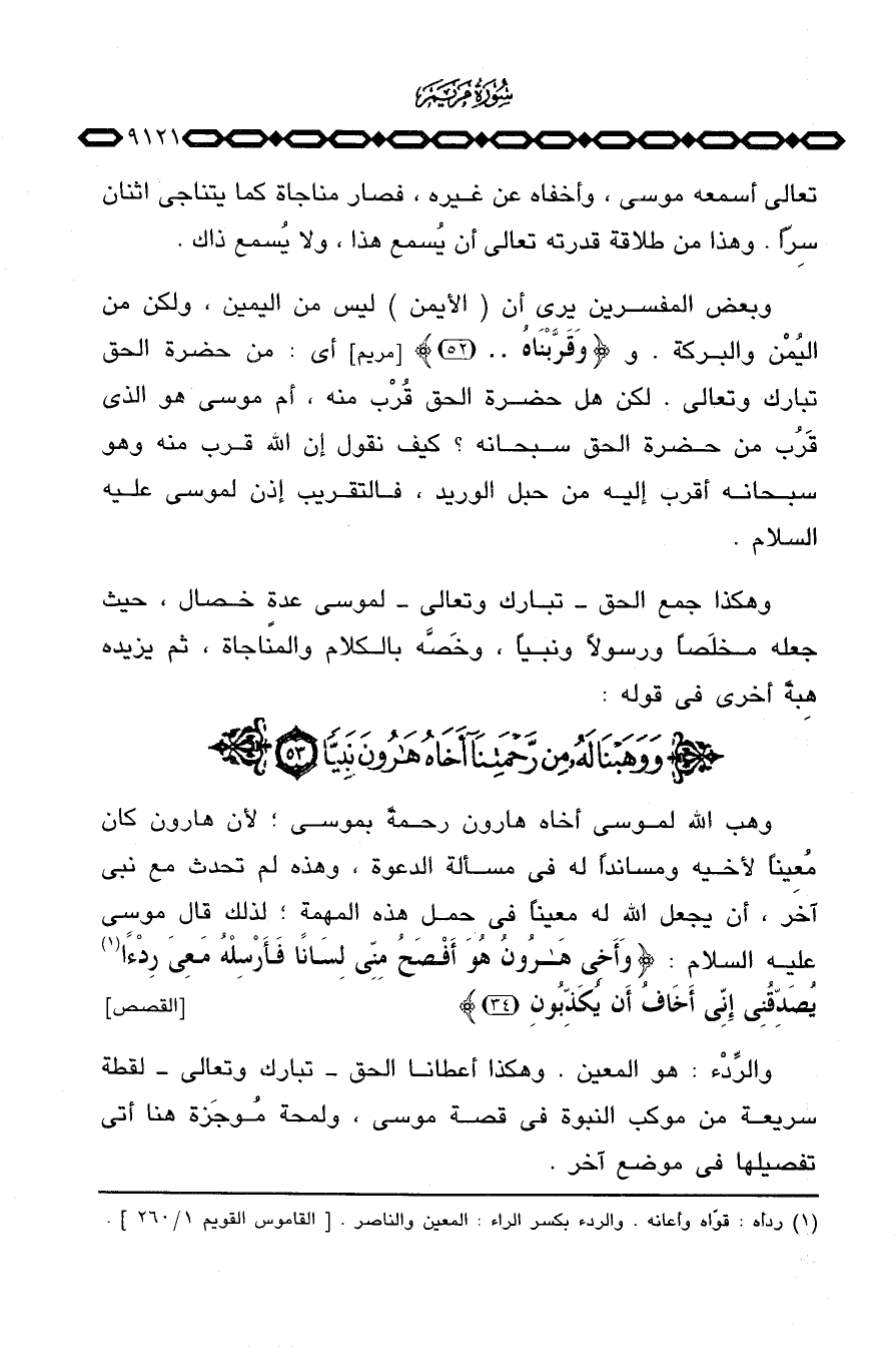 وبعض المفسرين يرى أن (الأيمن) ليس من اليمين، ولكن من اليُمْن والبركة. و {وَقَرَّبْنَاهُ} [مريم: 52] أي: من حضرة الحق تبارك وتعالى. لكن هل حضرة الحق قُرْب منه، أم موسى هو الذي قَرُب من حضرة الحق سبحانه؟ كيف نقول إن الله قرب منه وهو سبحانه أقرب إليه من حبل الوريد، فالتقريب إذن لموسى عليه السلام.