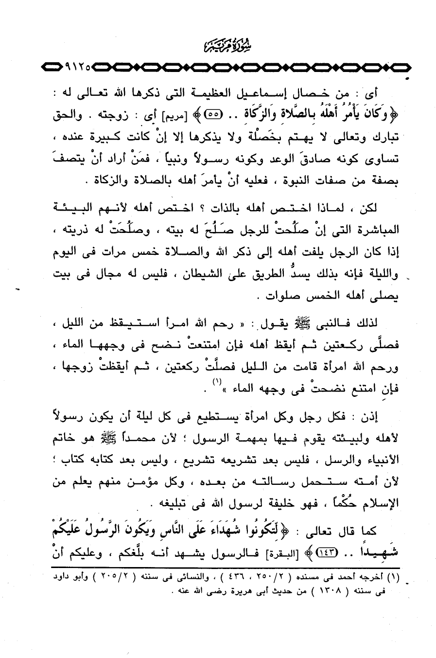 إذن: فكل رجل وكل امراة يستطيع في كل ليلة أن يكون رسولاً لأهله ولبيئته يقوم فيها بمهمة الرسول؛ لأن محمداً صَلَّى اللَّهُ عَلَيْهِ وَسَلَّم َ هو خاتم الأنبياء والرسل، فليس بعد تشريعه تشريع، وليس بعد كتابه كتاب؛ لأن أمته ستحمل رسالته من بعده، وكل مؤمن منهم يعلم من الإسلام حُكْماً فهو خليفة لرسول الله في تبليغه.