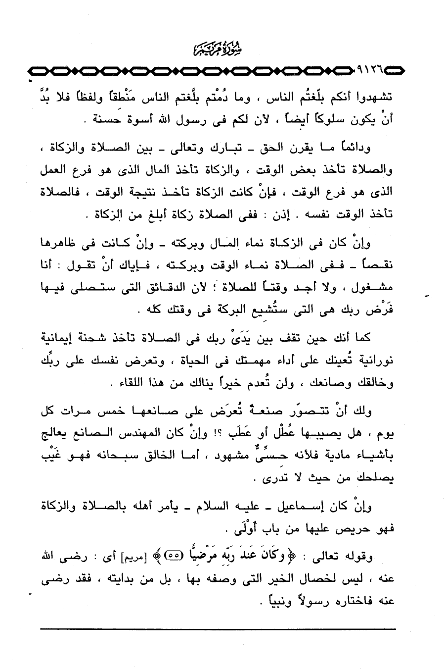 وإنْ كان في الزكاة نماء المال وبركته وإنْ كانت في ظاهرها نقصاً ففي الصلاة نماء الوقت وبركته، فإياك أنْ تقول: أنا مشغول، ولا أجد وقتاً للصلاة؛ لأن الدقائق التي ستصلي فيها فَرْض ربك هي التي ستُشِيع البركة في وقتك كله.