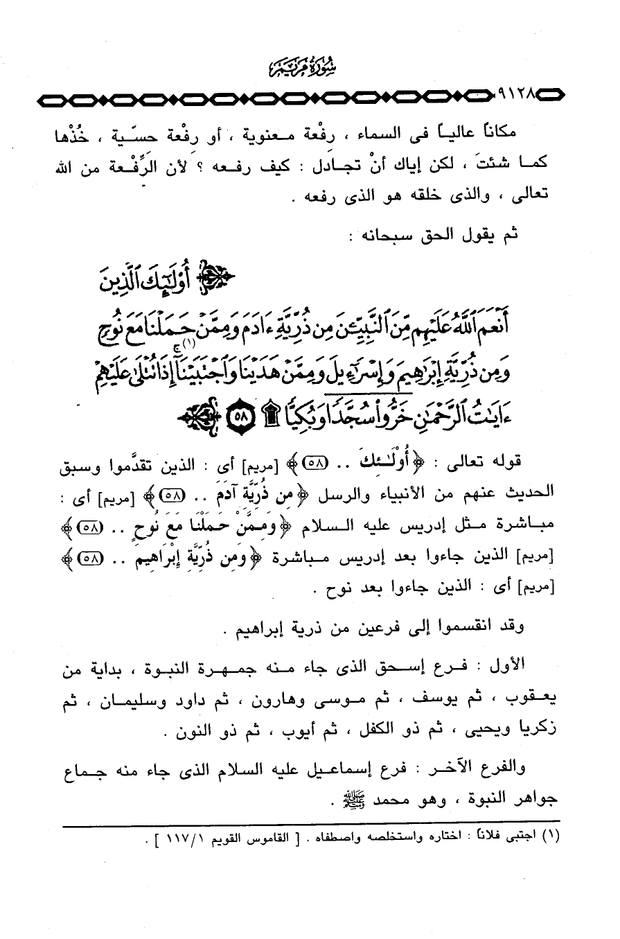 قوله تعالى: {أولئك} [مريم: 58] أي: الذين تقدَّموا وسبق الحديث عنهم من الأنبياء والرسل {مِن ذُرِّيَّةِءَادَمَ} [مريم: 58] أي: مباشرة مثل إدريس عليه السلام {وَمِمَّنْ حَمَلْنَا مَعَ نُوحٍ} [مريم: 58] الذين جاءوا بعد إدريس مباشرة {وَمِن ذُرِّيَّةِ إِبْرَاهِيمَ} [مريم: 58] أي: الذين جاءوا بعد نوح.
