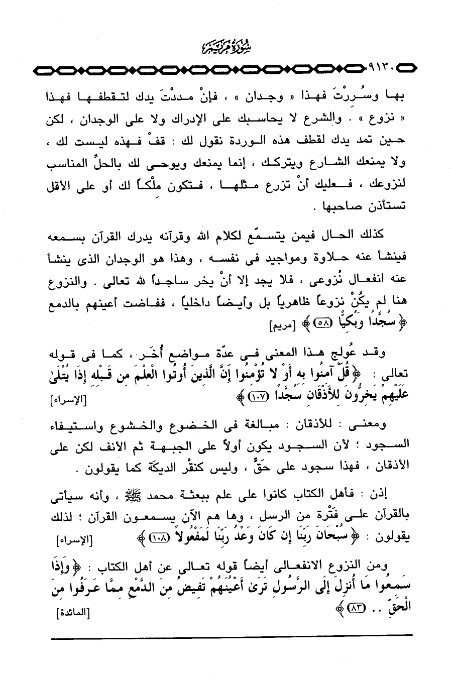 كذلك الحال فيمن تسمّع لكلام الله وقرآنه يدرك القرآن بسمعه فينشأ عنه حلاوة ومواجيد في نفسه، وهذا هو الوجدان الذي ينشأ عنه انفعال نُزوعي، فلا يجد إلا أنْ يخر ساجداً لله تعالى.