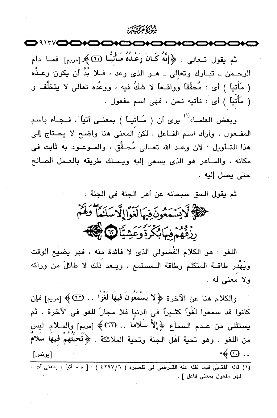 ثم يقول تعالى: {إِنَّهُ كَانَ وَعْدُهُ مَأْتِيّاً} [مريم: 61] فما دام الرحمن تبارك وتعالى هو الذي وعد، فلا بُدَّ أن يكون وعدُه (مَأْتِياً) أي: مُحقّقاً وواقعاً لا شَكَّ فيه، ووعْده تعالى لا يتخلَّف و (مَأْتِياً) أى نأتيه نحن، فهي اسم مفعول.