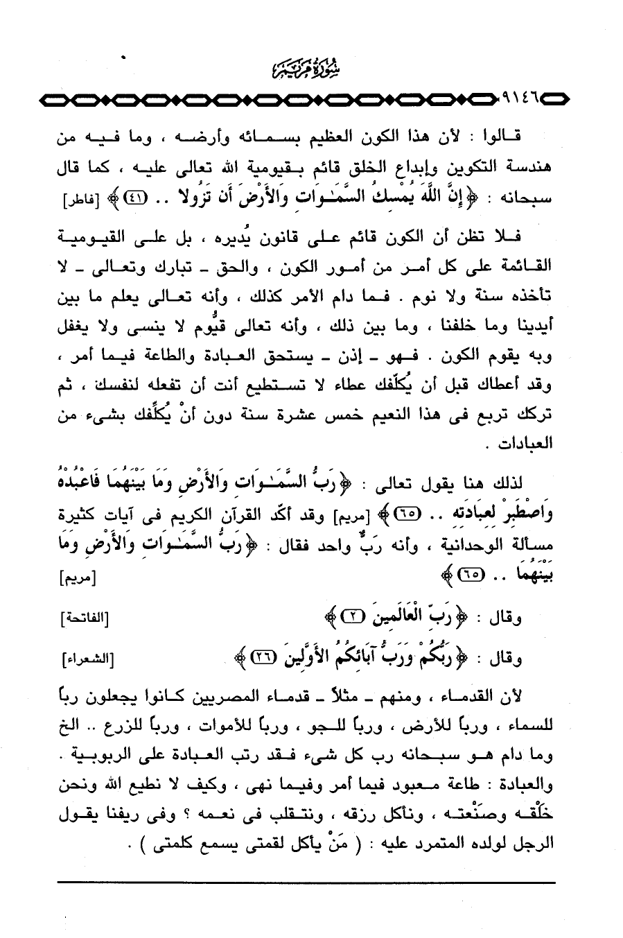 لأن القدماء، ومنهم مثلاً قدماء المصريين كانوا يجعلون رباً للسماء، ورباً للأرض، ورباً للجو، ورباً للأموات، ورباً للزرع. . إلخ وما دام هو سبحانه رب كل شيء فقد رتب العبادة على الربوبية. والعبادة: طاعة معبود فيما أمر وفيما نهى، وكيف لا نطيع الله ونحن خَلْقه وصَنْعته، ونأكل رزقه، ونتقلب في نعمه؟ وفي ريفنا يقول الرجل لولده المتمرد عليه: (مَنْ يأكل لقمتي يسمع كلمتي) .