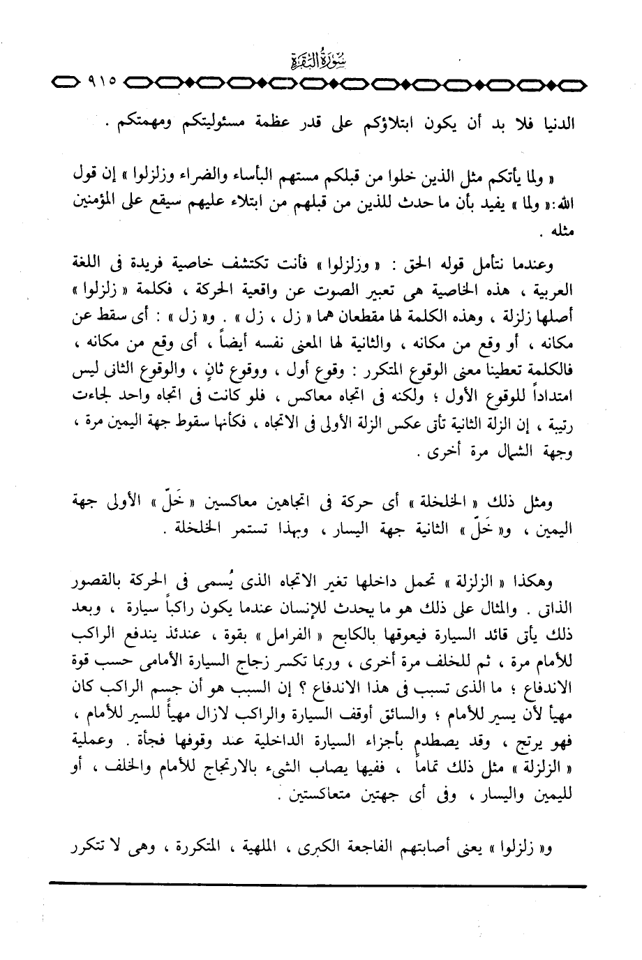 وعندما نتأمل قوله الحق: {وَزُلْزِلُواْ} فأنت تكتشف خاصية فريدة في اللغة العربية، هذه الخاصية هي تعبير الصوت عن واقعية الحركة، فكلمة «زلزلوا» أصلها زلزلة، وهذه الكلمة لها مقطعان هما «زل، زل» . و «زل» : أي سقط عن مكانه، أو وقع من مكانه، والثانية لها المعنى نفسه أيضاً، أي وقع من مكانه، فالكلمة تعطينا معنى الوقوع المتكرر: وقوع أول، ووقوع ثانٍ، والوقوع الثاني ليس امتداداً للوقوع الأول؛ ولكنه في اتجاه معاكس، فلو كانت في اتجاه واحد لجاءت رتيبة، إن الزلة الثانية تأتي عكس الزلة الأولى في الاتجاه، فكأنها سقوط جهة اليمين مرة، وجهة الشمال مرة أخرى.