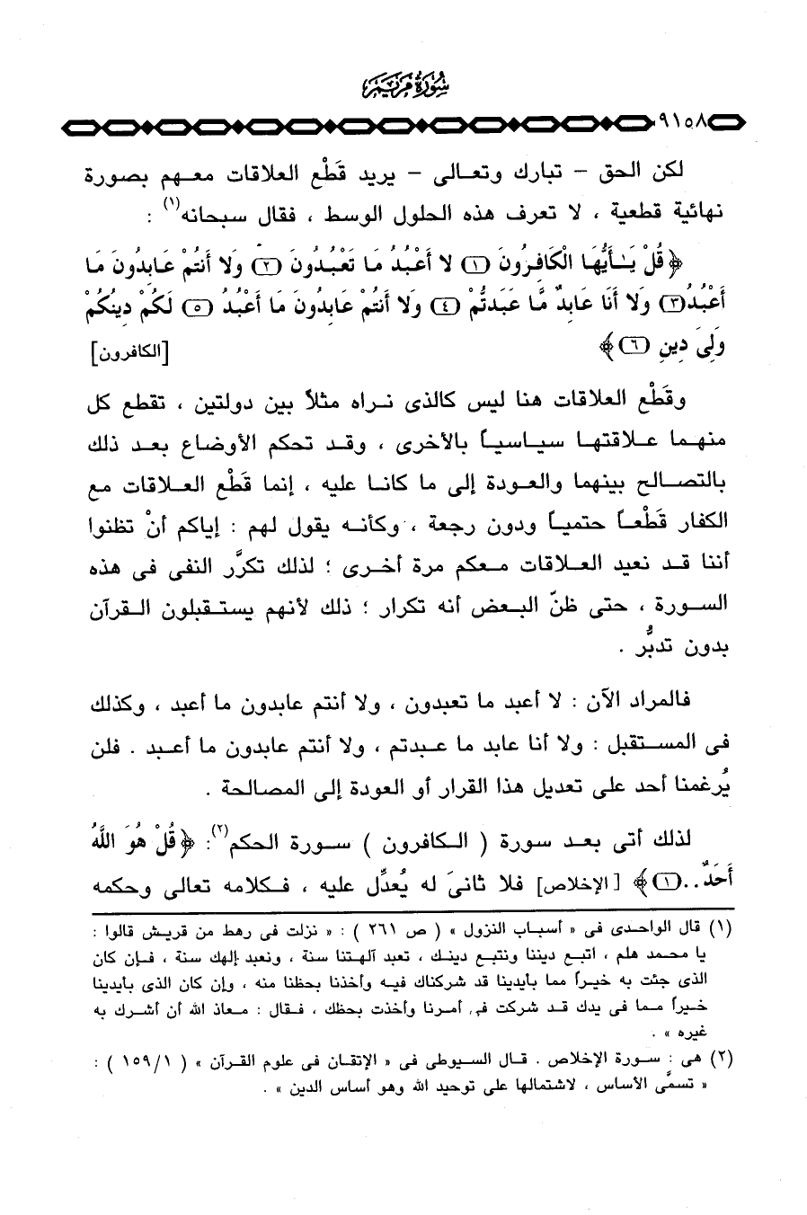 فالمراد الآن: لا أعبد ما تعبدون، ولا أنتم عابدون ما أعبد، وكذلك في المستقبل: ولا أنا عابد ما عبدتم، ولا أنتم عابدون ما أعبد. فلن يُرغمنا أحد على تعديل هذا القرار أو العودة إلى المصالحة.