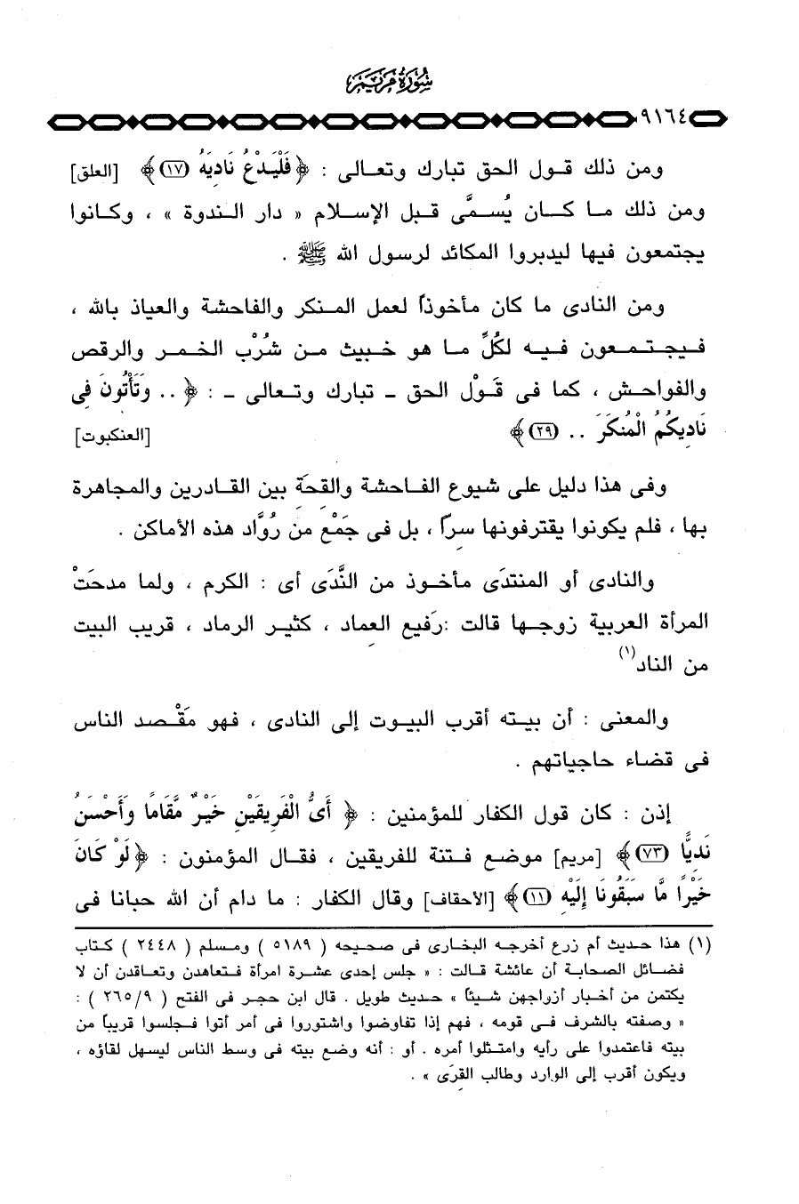 ومن ذلك قول الحق تبارك وتعالى: {فَلْيَدْعُ نَادِيَهُ} [العلق: 17] ومن ذلك ما كان يُسمَّى قبل الإسلام «دار الندوة» ، وكانوا يجتمعون فيها ليدبروا المكائد لرسول الله صَلَّى اللَّهُ عَلَيْهِ وَسَلَّم َ.