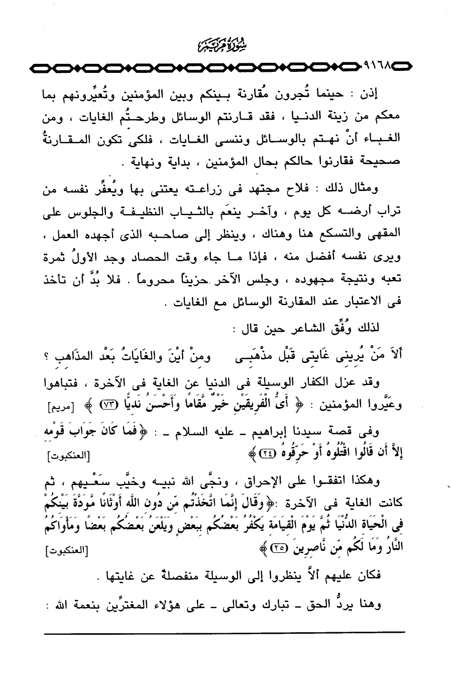 وقد عزل الكفار الوسيلة في الدنيا عن الغاية في الآخرة، فتباهوا وعَيَّروا المؤمنين: {أَيُّ الفريقين خَيْرٌ مَّقَاماً وَأَحْسَنُ نَدِيّاً} [مريم: 73] .